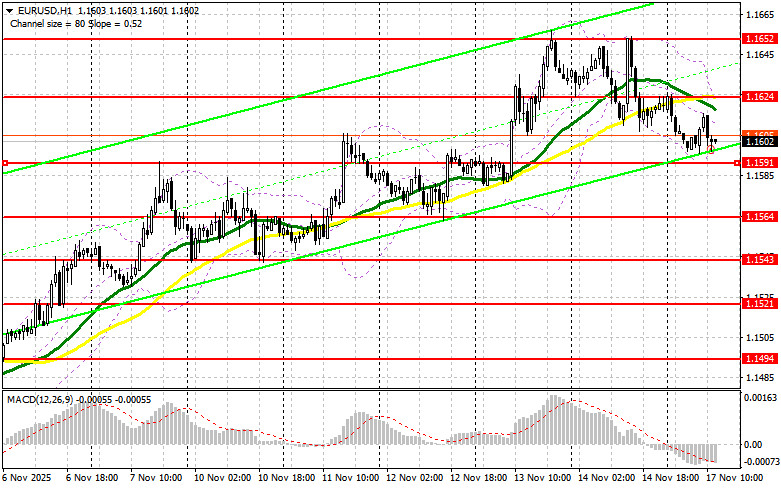 Индекс потребительских цен в Италии снизился и полностью совпал с прогнозами экономистов. Это ограничило волатильность в паре EUR/USD, которая составила всего порядка 18 пунктов. Во второй половине дня нас ждет лишь производственный индекс Empire Manufacturing, а также ряд выступлений представителей ФРС в лице Джона Уильямса, Филипа Н. Джефферсона и Кристофера Уоллера. Многие из низ выступают за более постепенный подход к дальнейшему снижению ставок в США, что может ограничить восходящий потенциал пары. В случае дальнейшей нисходящей коррекции, формирования ложного пробоя в районе ближайшей поддержки 1.1591 будет достаточно для открытия длинных позиций в расчете на рост к сопротивлению 1.1624. Прорыв и обратный тест этого диапазона сверху вниз станут подтверждением правильной точки вход с движением к области 1.1652. Самой дальней целью будет уровень 1.1678, где буду фиксировать прибыль. При варианте снижения EUR/USD и отсутствия активности в районе 1.1591, давление на евро возрастет. Медведи в таком случае сумеют дотянуться до 1.1564. Лишь после формирования там ложного пробоя собираюсь действовать на покупку евро. Открывать длинные позиции сразу на отскок планирую от 1.1543 с целью восходящей коррекции в 30-35 пунктов внутри дня.